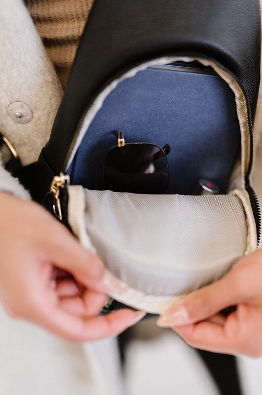 The Camry Sling Crossbody. This silky-soft vegan leather bag fits everything you need while you're on the go, without being bulky. The front pocket zips for easy phone access, while the other pockets are ideal for keys, your wallet, and other small trinkets. This minimalistic dream bag is complete with gold hardware and an m+c logo in the bottom right corner.