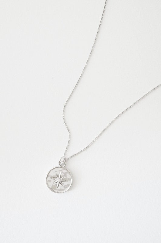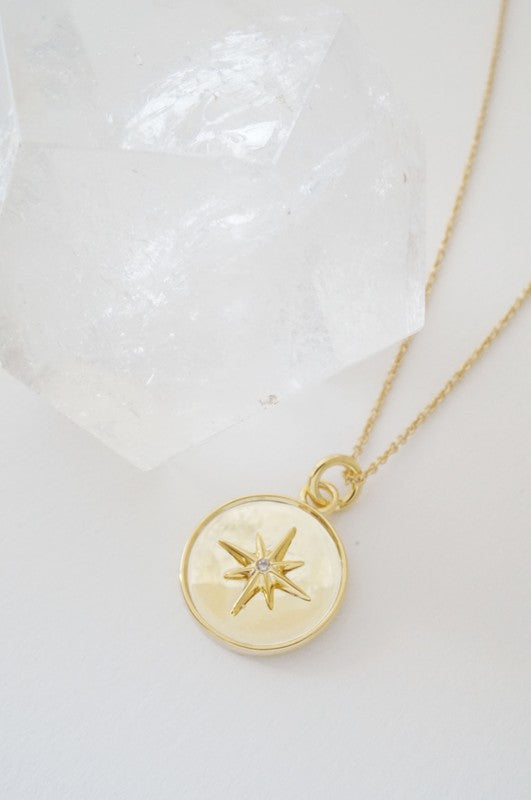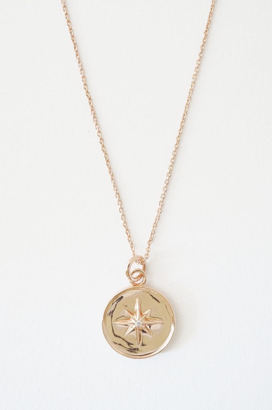 A pendant necklace featuring a celestial starburst dotted with a tiny crystal in its center.