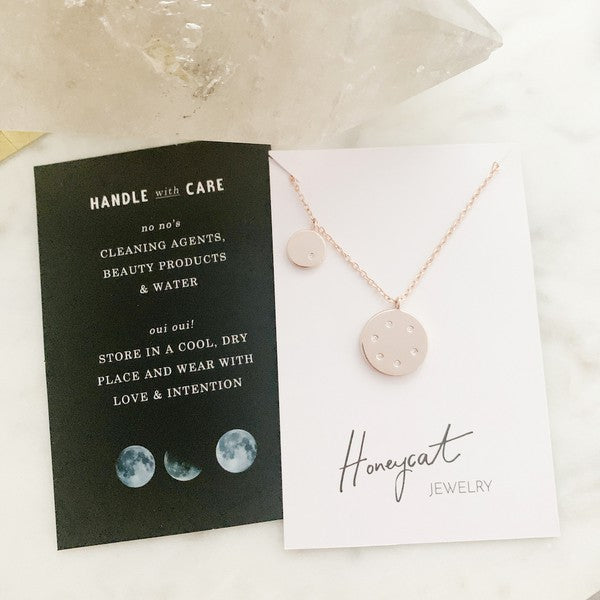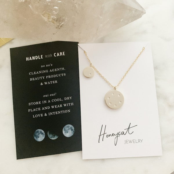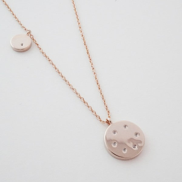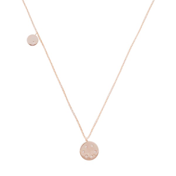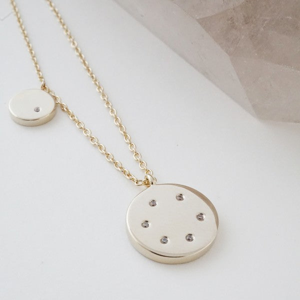 A necklace strung with two contrasting and complementing discs with the ever so slightest bit of sparkle to them. The large disc is dotted with a circle of tiny crystals. Relaxed but elegant - this beauty is easy to dress up or down. Length: Adjustable (14" - 17.5"). Charms: 13mm, 8mm.