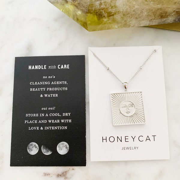 A pendant necklace featuring a sun goddess and her light rays strung upon a beaded satellite chain. Wear it solo or layered alongside with your favorite necklaces.