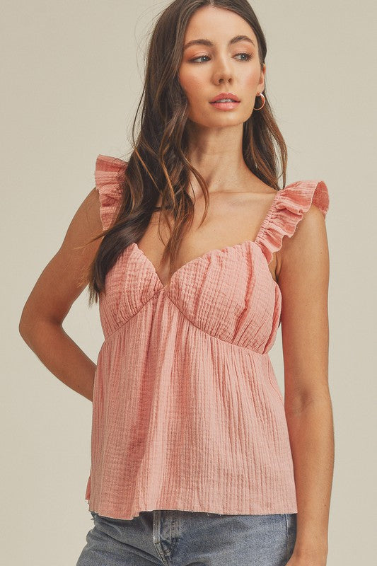 Live, laugh, love in the boho chic Trixie Top with ruffled shoulders for a true boho look.